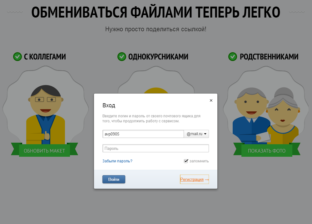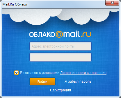Для начала работы с «Облаком Mail.Ru» достаточно указать свои имя пользователя и пароль, используемые в сервисах MAIL.RU GROUP. Тем, кто ранее не пользовался сервисами Mail.Ru, понадобится зарегистрировать новый аккаунт.