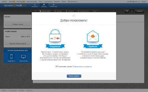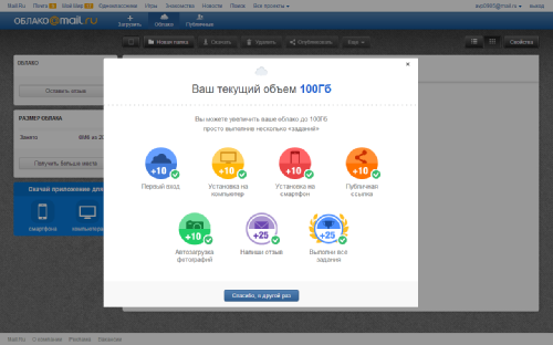 После перехода по содержащейся в письме ссылке вы попадаете в «Личный кабинет» web-интерфейса сервиса. Как и в других сервисах, для начала работы с «Облаком Mail.Ru» понадобится принять условия лицензионного соглашения. Изначально пользователю доступно 10 Гб облачного пространства, а для расширения до тех самых 100 Гб необходимо выполнить ряд простых действий. Выполнять шаги можно в произвольном порядке.