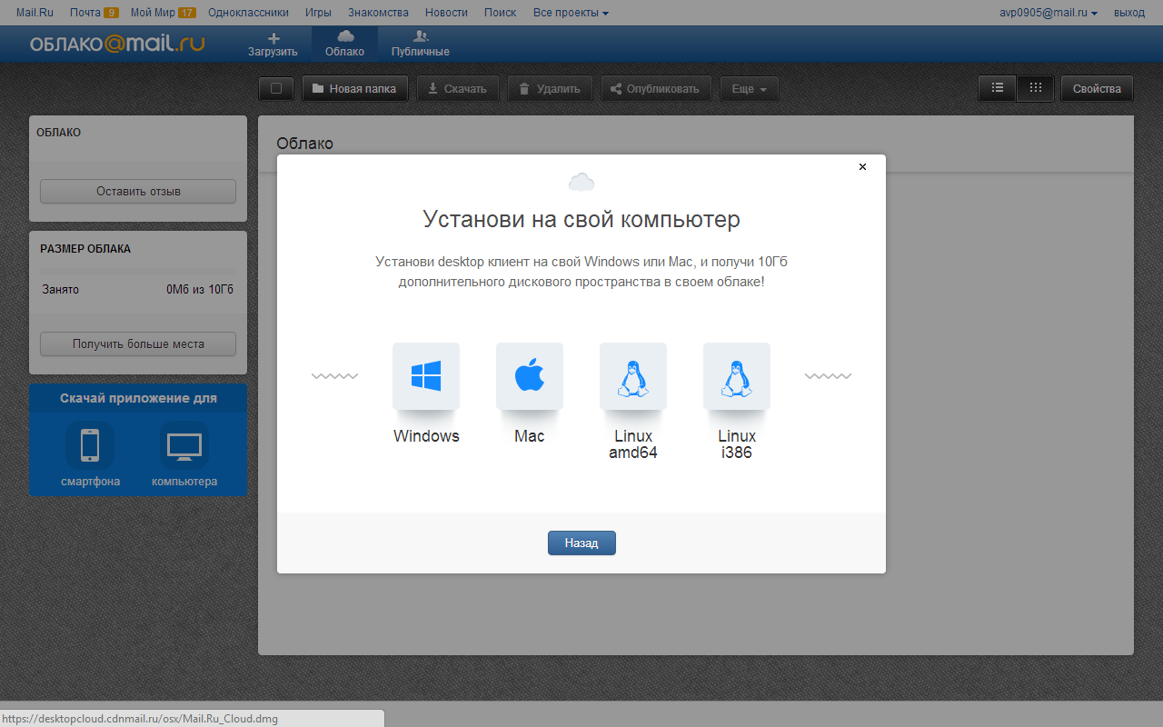 Первым шагом к заветным 100 Гб является установка настольного клиента сервиса. За выполнение этой операции размер аккаунта увеличивается на 10 Гб.