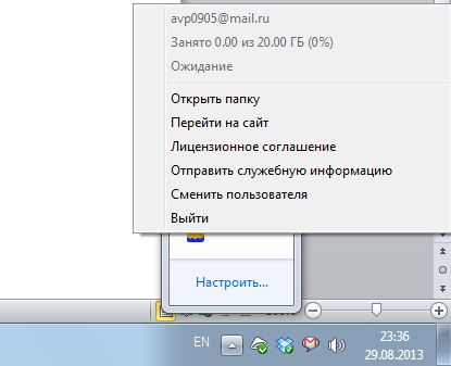 Начало работы с настольной программой также начинается с ввода данных учетной записи Mail.Ru и приема условий лицензионного соглашения. Далее будет предложено задать местоположение облачной папки. Собственно на этом первоначальная настройка настольного клиента завершена, а его значок появляется в системном трее. При щелчке левой клавишей мыши по значку «Облака Mail.Ru» на экран выводится окно проводника, в котором открывается локальная «облачная папка», а для вызова контекстного меню используется правая кнопка. Впрочем, чего-либо интересного в этом меню нет.