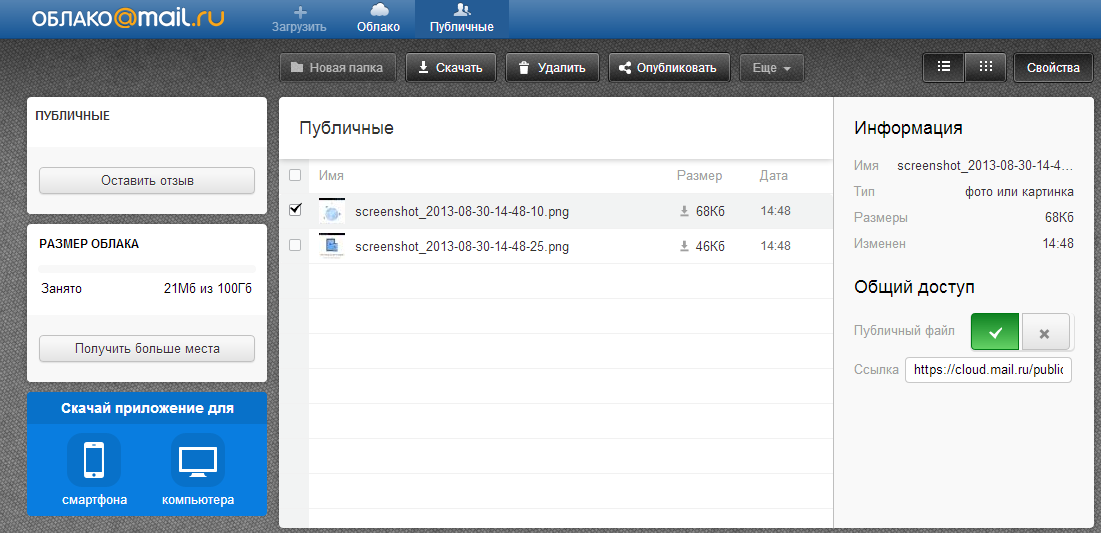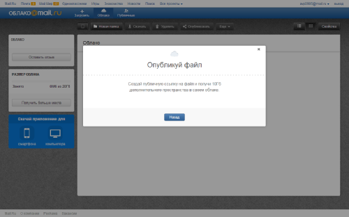 Еще 10 Гб будет предоставлено за создание публичной ссылки на находящийся в облаке файл или папку. Сделать это элементарно – выбираем нужный файл и нажимаем кнопку «Опубликовать», обозначенную стандартной для этих случаев иконкой. Причем, ссылку на файл можно в один шаг разместить в популярных социальных сетях – «Мой мир», «Одноклассники», «ВКонтакте», Facebook и Twitter.