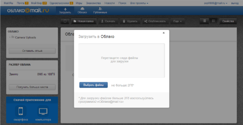 Диалоговое окно web-интерфейса состоит из трех вкладок – «Загрузить», «Облако» и «Публичные», о назначении которых можно догадаться по названиям. При загрузке файлы можно «перетаскивать» на соответствующий элемент web-страницы. Причем, в облако можно перетащить папку целиком. Однако она загружается без разделения на вложенные папки, что может доставить некоторые неудобства. Таким образом, копировать папки целиком следует через настольное приложение. Кроме того, настольным приложением придется воспользоваться для размещения в облаке файлов объемом больше 2 Гб.