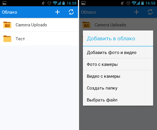 В аналогичном «легком» стиле выполнен и мобильный клиент. Его основной экран отображает список находящихся в облаке файлов и папок, также присутствует кнопка, позволяющая в одно касание добавить новый объект. Причем, в качестве отдельных пунктов выделено добавление контента с камеры.