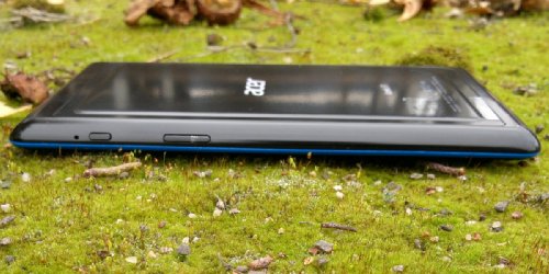 Дизайн Iconia Tab B1-A71 можно назвать стандартным для планшетных компьютеров начального ценового диапазона. Однако, в Acer попытались немного оживить внешность B1-A71, добавив на торцы кант цвета «электрик» (голубовато-синий) и значок «Iconia» того же цвета на переднюю панель. На мой взгляд, получилось не очень. Причем если кант смотрится вполне уместно, то значок «Iconia», выполненный в виде наклейки, выглядит непростительно дешево. Особенно когда планшетом попользуешься некоторое время.