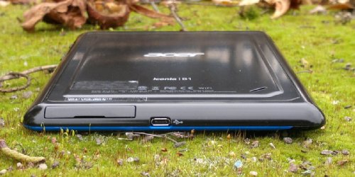 На верхнем торце находится гнездо для подключения гарнитуры, а снизу расположились microUSB-разъем и закрытый крышкой слот для карт памяти microSD. Форма боковых граней Acer Iconia Tab B1-A71 немного скругленная, благодаря чему планшет удобно держать в руках.