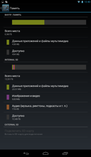 Встроенная память разделена на два раздела – 0,98 Гб определяется как внутренняя память, а оставшееся место – как «Internal SD» (встроенная карта памяти). В 16 Гб версии планшета объем «Internal SD» составляет 12,5 Гб.