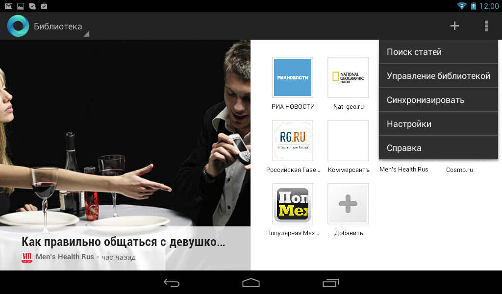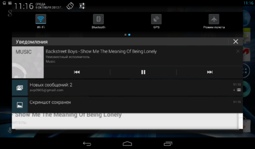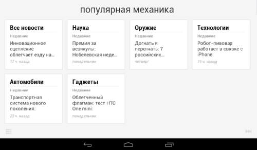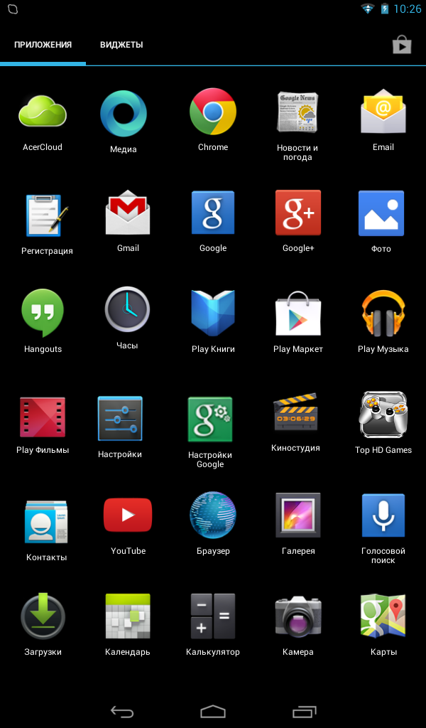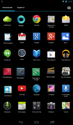 Как уже упоминалось, аппаратных/сенсорных кнопок в Iconia Tab B1-A71 не предусмотрено, поэтому все управление выполняется с помощью экранных кнопок «Назад», «Домой» и «Приложения» (при ее нажатии на экран выводится список приложений). Кнопки вызова меню не предусмотрено, ее роль выполняет соответствующий управляющий элемент интерфейса приложений.