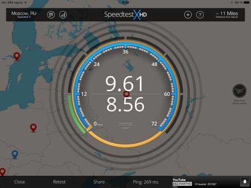 Тестирование подключения к сети по Wi-Fi показала весьма достойную скорость, соответствующую заявленным цифрам.