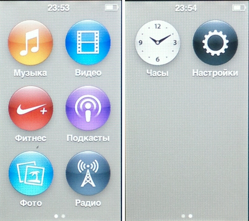 Меню iPod nano 7 представляет собой матрицу размером 2х3 иконки, которая разместилась на двух экранах. На первом рабочем столе находятся иконки, дающие доступ ко всем основным возможностям плеера – музыке, видео, подкастам, радио, фотографиям и фитнес-приложениям. Со второго рабочего стола можно перейти к часам (здесь же – секундомер и таймер) и настройкам.