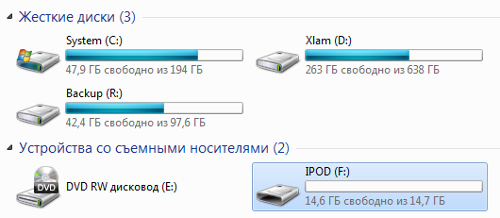 Однако меня, как человека далекого от техники Apple, немного пугали вопросы, связанные с тем, как подружить iPod nano 7 с компьютером. На первый взгляд, все показалось довольно просто – при подключении с помощью комплектного кабеля iPod nano 7 опознался как съемный диск. А значит, его можно использовать как флэш-накопитель.