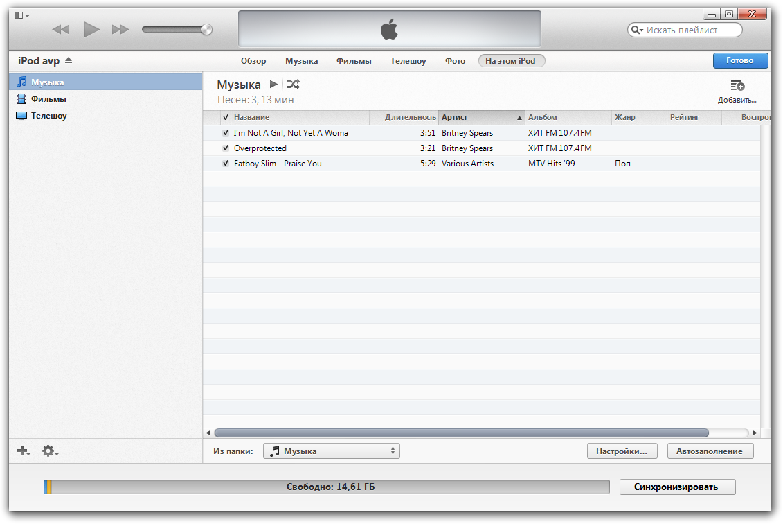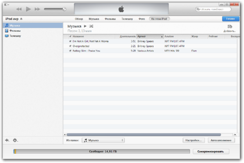 Однако простое копирование музыкальных файлов на iPod nano 7 оказалось бесполезным – после отключения от компьютера плеер трэков не увидел и продолжал предлагать синхронизироваться с iTunes. Поэтому, без установки программы обойтись не удалось. Впрочем, перетащить файлы из папки на компьютере в соответствующее плееру окно iTunes и нажать кнопку «Синхронизировать» не сложнее, чем скопировать их на USB-накопитель. Впрочем, на мой взгляд, те, кто приобрел себе iPod, должны более детально разобраться с функционалом iTunes и использовать все возможности этого приложения.
