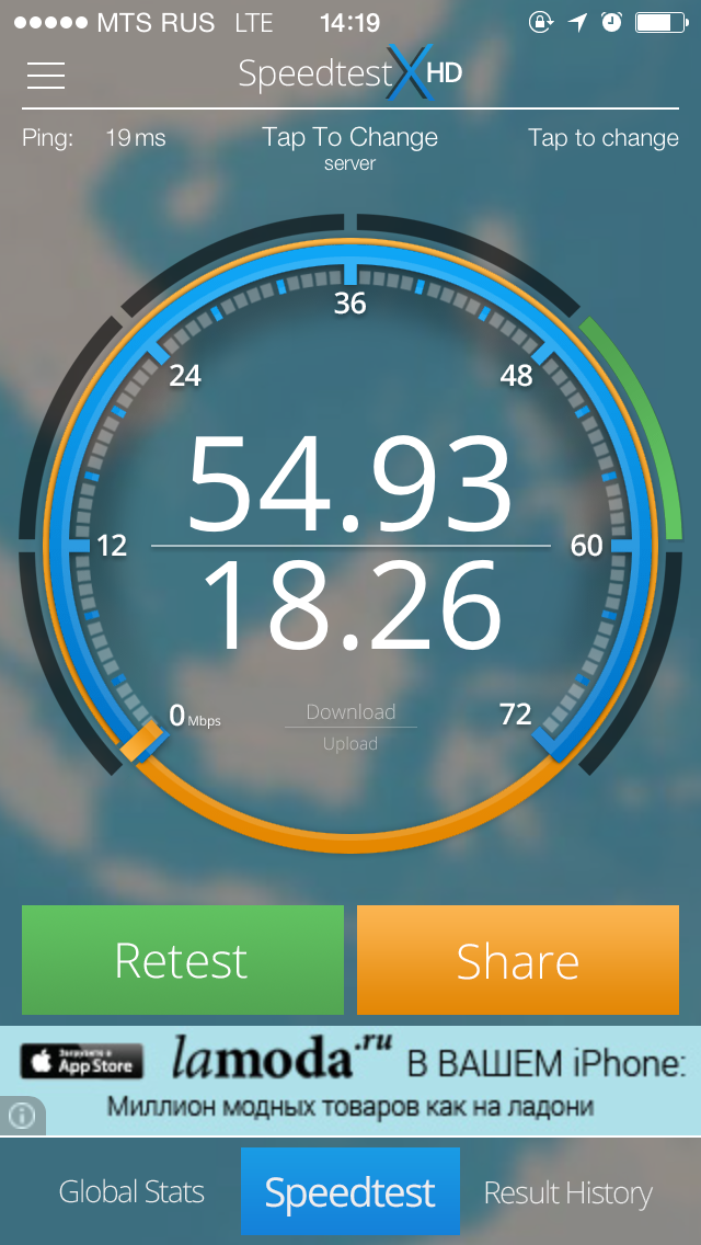 Со временем ситуация постепенно улучшалась, и на сегодняшний день компания МТС заявляет об уверенном покрытии Москвы сетями четвертого поколения. Тесты показали, что покрытие действительно улучшилось очень заметно – слепых зон практически не осталось, а максимальная скорость передачи данных, которой можно достичь сегодня в Москве при использовании iPhone 5S составляет 54,93 Мб/с – download и 18,84 МБ/с – upload.