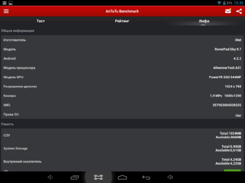 За время тестирования RoverPad Sky 9.7 каких-либо претензий к скорости и стабильности работы устройства у меня не возникло. Интерфейс операционной системы работает плавно, а производительности работы этого планшетного компьютера хватает для подавляющего большинства приложений (не считая «тяжелых» игр). Одним словом, устройство для тех, кому нужен недорогой планшетный компьютер для интернета, социальных сетей и «легких» игр.