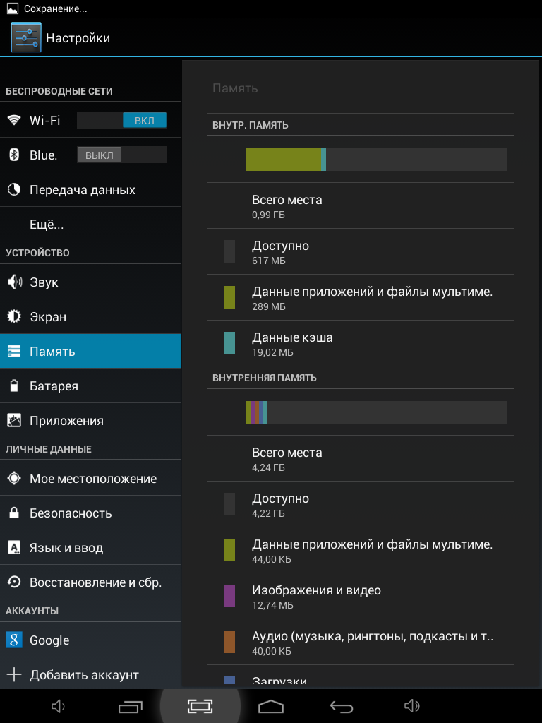 Объем ОЗУ – 1 Гб, встроенной памяти – 8 Гб. Разделение стандартное – под «Внутр. память» выделено 1 Гб, а оставшиеся 4,24 Гб отведены под «Внутреннюю память».