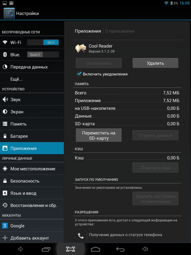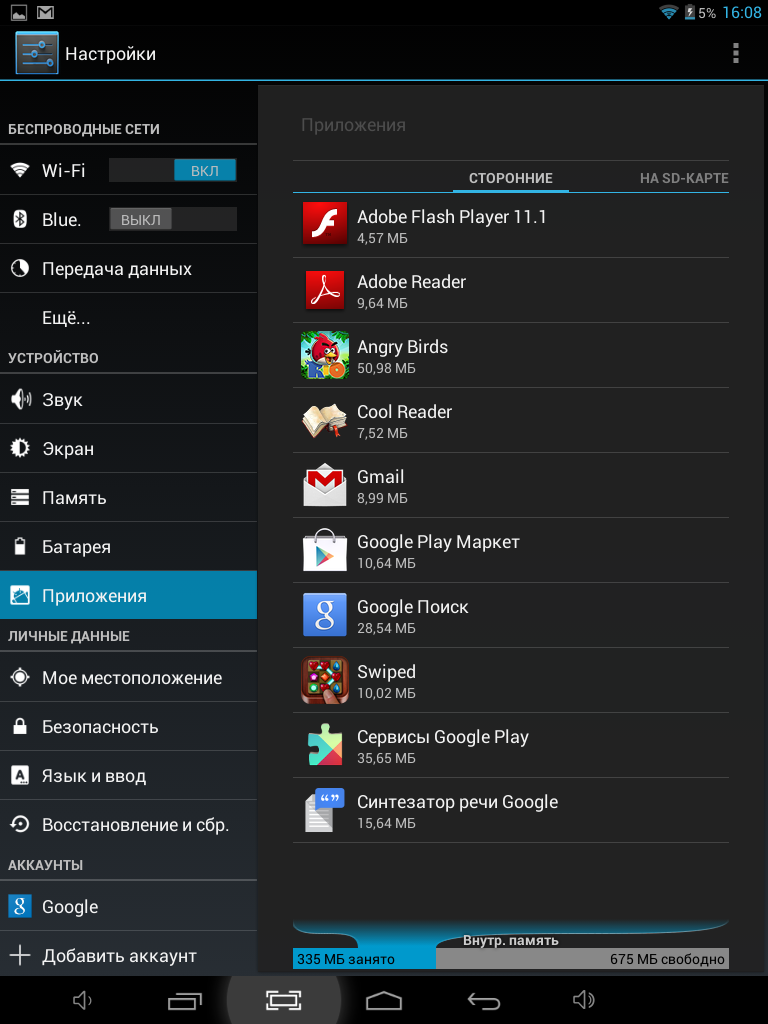 Набор предустановленных приложений минимален. Из программ можно отметить «Cool Reader», «Adobe Reader» и «Adobe Flash Player» , а из игр – «Swiped» и «Andry Birds Rio». Что интересно – «Cool Reader», «Adobe Reader» и «Andry Birds Rio» оказалось возможно удалить стандартным образом, освободив столь ценное место в памяти устройства.