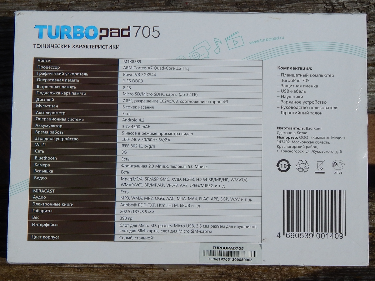 В части аппаратной платформы каких-либо сюрпризов от TurboPad 705 ждать не стоит. «Сердце» этого планшетного компьютера – привычный по недорогим планшетам с поддержкой 3G-сетей 1,2 ГГц процессор MT8389 (4-е ядра Cortex A7, графический ускоритель PowerVR SGX 544MP) дополненный 1 Гб ОЗУ.