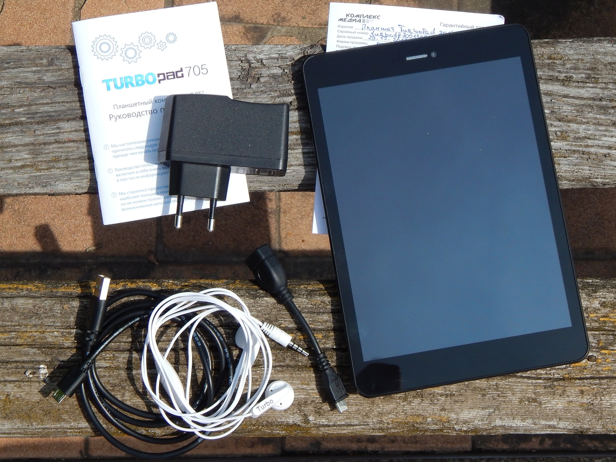 В целом комплект поставки TurboPad 705 можно назвать стандартным и вполне достаточным. Немного смущает только сочетание черных аксессуаров (зарядное устройство, USB-кабель, OTG-переходник) и белой гарнитуры. Конечно они вряд ли будут использоваться вместе, но разноцветные аксессуары в комплекте поставки одного и того же устройства у меня вызывают чувство некоторого дисбаланса.