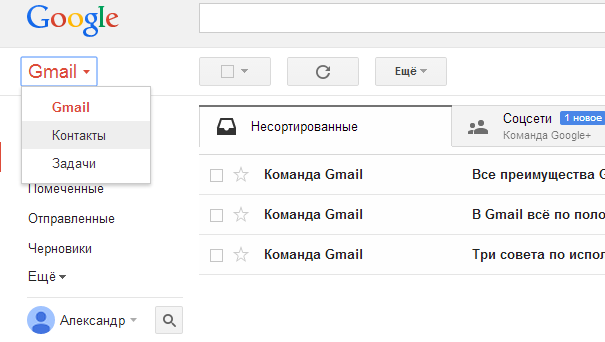 Для загрузки контактов на сервера Google входят в аккаунт Gmail и в находящемся в левом верхнем углу выпадающем списке выбирают «Контакты».