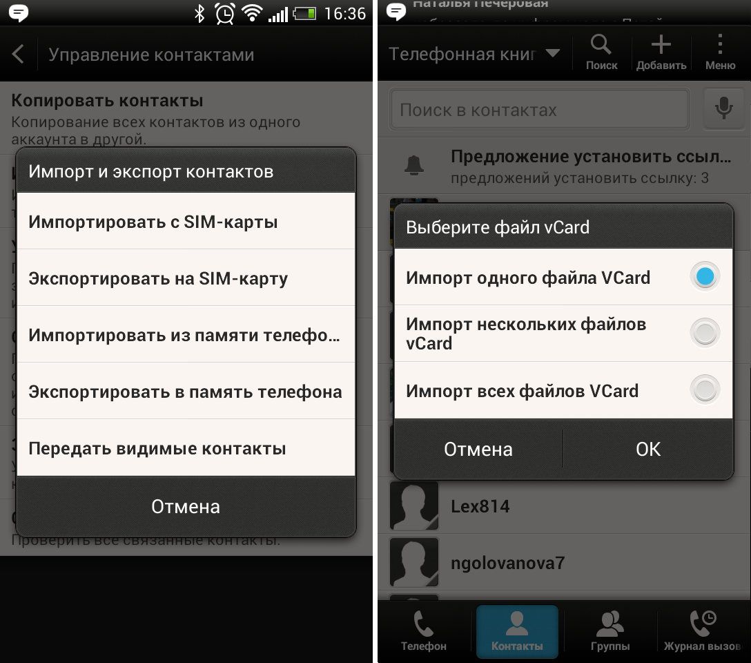 Поэтому массовый импорт vCard удобнее выполнять средствами смартфона с Android, позволяющего все vCard импортировать в одно действие. Для выполнения этой операции сначала копируют нужные vcf-файлы в память смартфона, а затем в меню адресной книги Android выбирают пункт «Импорт/Экспорт -> Импортировать с SD карты» (в зависимости от производителя устройства и версии ОС возможны вариации).
