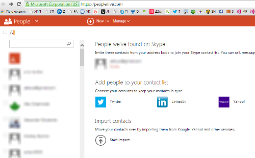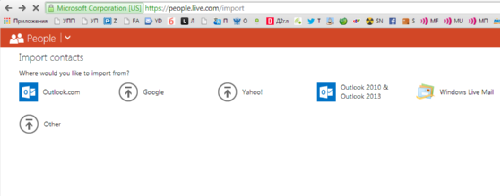 При работе с сервисами Microsoft операция импорта контактов выполняется аналогичным образом – авторизуются на портале «Microsoft Live» и щелкают по ссылке «Start Import». При этом в качестве источника могут выступать как CSV-файлы, так и другие сервисы, например, аккаунт Google (данные из аккаунта Google также предлагается экспортировать через файл формата CSV).