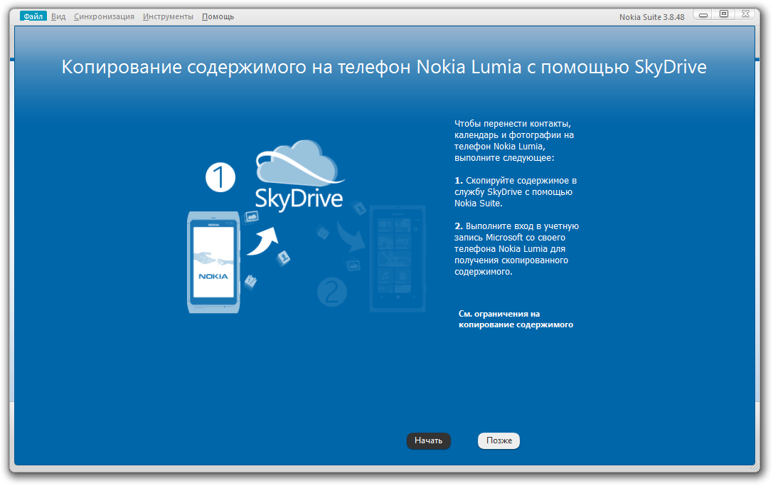 Затем, на главной вкладке диалогового окна «Nokia Suite», выбирают пункт «Копирование содержимого на телефона Nokia Lumia» и следуют выводимым на экран инструкциям. Перенос данных выполняется посредством SkyDrive, поэтому для выполнения операции понадобится ввести пароль от своей учетной записи Microsoft.