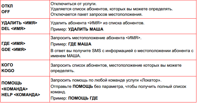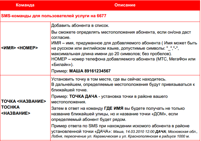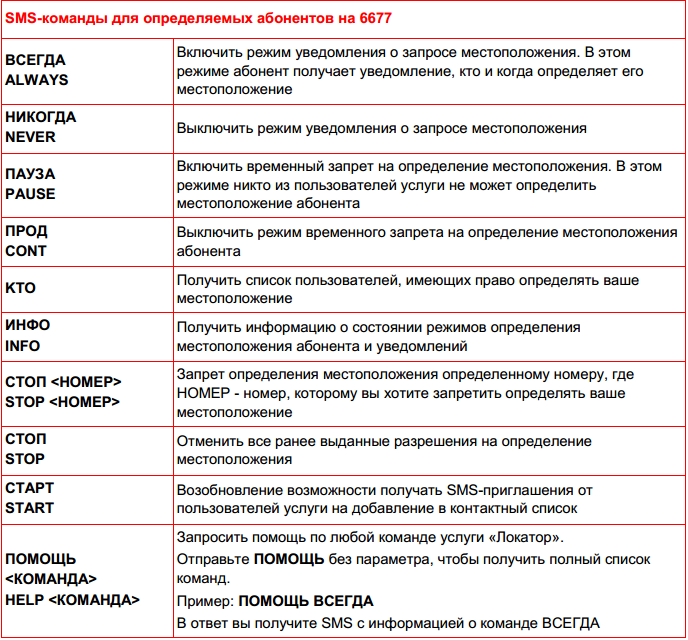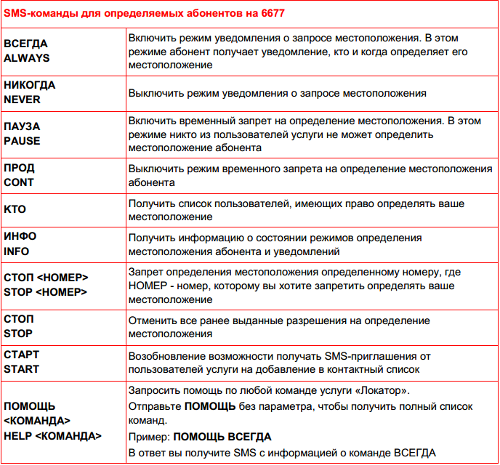 Полный список sms-команд приведен в «Руководстве пользователя». Кстати, среди команд есть довольно интересные. Например, отправив на номер 6677 команду «ВСЕГДА» определяемый абонент будет в курсе, кто и когда определяет его местоположение.