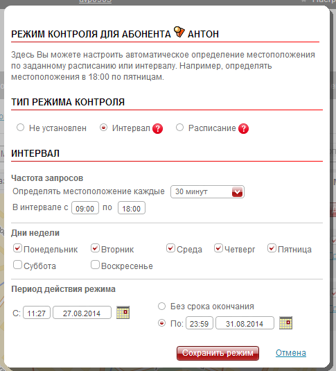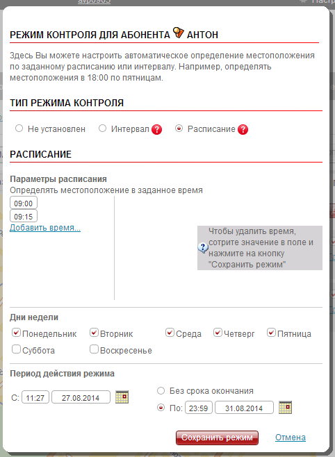 Также можно настроить определение местоположений по расписанию, для чего служит одноименная гиперссылка. При создании расписания можно задать как интервал, с которым будут отправляться запросы, так и сформировать набор «контрольных моментов», когда будет запрашиваться местоположение. Причем, определение местоположений по расписанию можно ограничить определенным временем и днями недели.