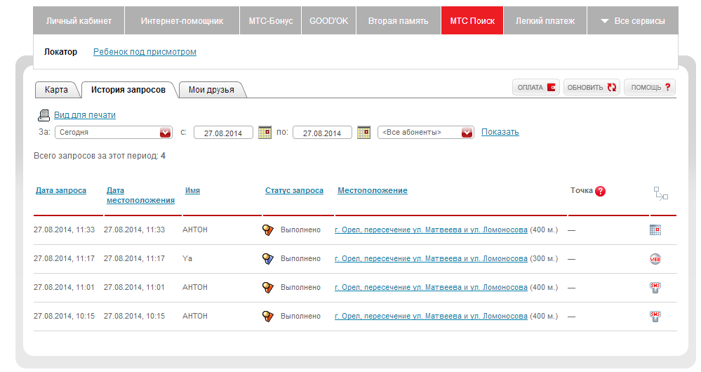 Результаты определения местоположения по расписанию доступны в разделе «История запросов», при просмотре которой можно выбрать нужные даты и интересующего абонента.