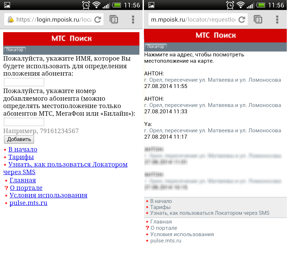 Услуга «Локатор» универсальна. С ее помощью можно определять местоположения абонентов МТС, Билайн и МегаФон, причем каких-либо требований к мобильному телефону человека, чье местоположение определяется, не предъявляется. Подойдет совершенно любой телефон, умеющий работать в 2G или 3G-сетях, даже сверхбюджетные «звонилки». Также не требуется каких-либо специальных настроек. Достаточно, чтобы абонент дал согласие на определение своего местоположения. Пользоваться «Локатором» можно посредством SMS-команд на номер 6677, web-интерфейса mpoisk.ru и мобильного приложения для Android/iOS. Стоимость услуги – 100 рублей в месяц за 100 запросов определения местоположения. 101 и последующие запросы тарифицируются по 10 рублей за каждый. При первичном подключении первые 2 недели использования услуги предоставляются бесплатно. Подробная информация об услуге «Локатор» приведена в «Руководстве пользователя».