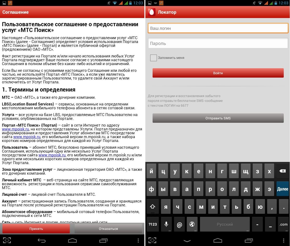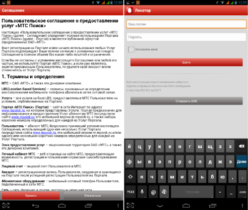 При первом запуске мобильного приложения «МТС Локатор» понадобится принять условия предоставления услуг и, аналогично веб-версии, ввести свои логин/пароль.