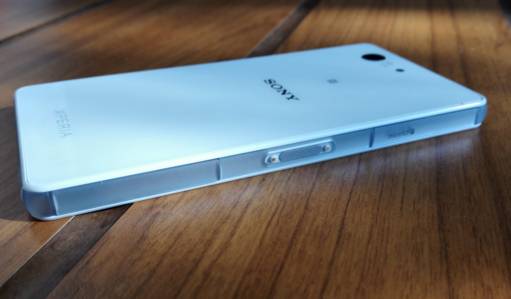 Что перекочевало в Compact из «большого» Z3, так это уголки из поликарбоната, которые внедрены в алюминиевую раму. Они предназначены для снижения динамического воздействия на начинку смартфона при его падении на угол, а такие падения случаются весьма часто. И если в Z3 эти уголки смотрятся несколько вычурно, то в Compact они практически незаметны под кантом из полимера. В результате смартфон выглядит более цельно.
