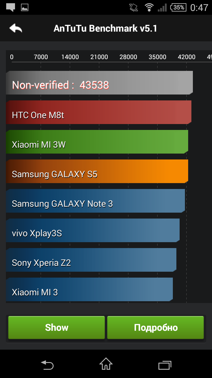 Xperia Z3 Compact – очень производительный смартфон. Это видно при повседневном использовании, и более чем наглядно демонстрируется в синтетических тестах. Я не очень люблю меряние попугаями, но 43,5 тысячи в AnTuTu это превосходный результат, оставляющий далеко позади любых конкурентов, вроде HTC One M8 и Galaxy S5. И здесь нет никакой магии – сказывается упрощенный дисплей, который снижает нагрузку на систему, высвобождая ресурсы для других вычислений.