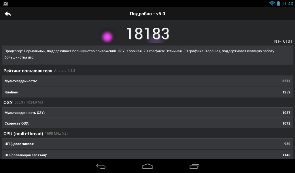 Зато низкое разрешение экрана позволяет iconBIT NetTAB THOR LE демонстрировать хорошие результаты в тестах производительности. Даже с учетом устаревшей SoC RockChip RK3066, включающей два ядра Cortex A9.