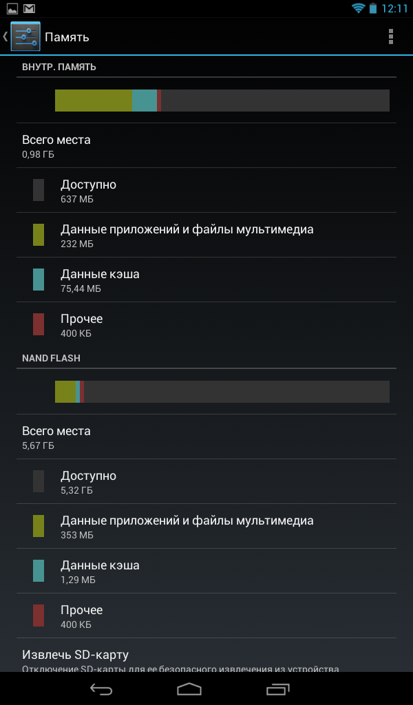 Объем ОЗУ – 1 Гб, для дешевого планшета этого достаточно. Внутренняя память – 8 или 16 Гб, в зависимости от модификации. Однако, ее разбиение типично для китайских планшетов – 0,98 Гб отведено на «Внутр. памяти», а остаток определяется как «NAND FLASH». Соответственно, возможны проблемы при установке «тяжелых» и не переносимых приложений.