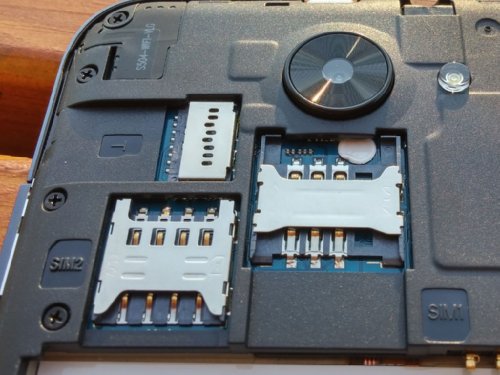 На задней крышке объектив камеры, выпополненный в виде эффектного выступающего круглого модуля, здесь же светодиодная вспышка. Сама крышка съемная, под ней съемный же аккумулятор и два слота для SIM-карт. Слоты разноформатные – SIM и microSIM.