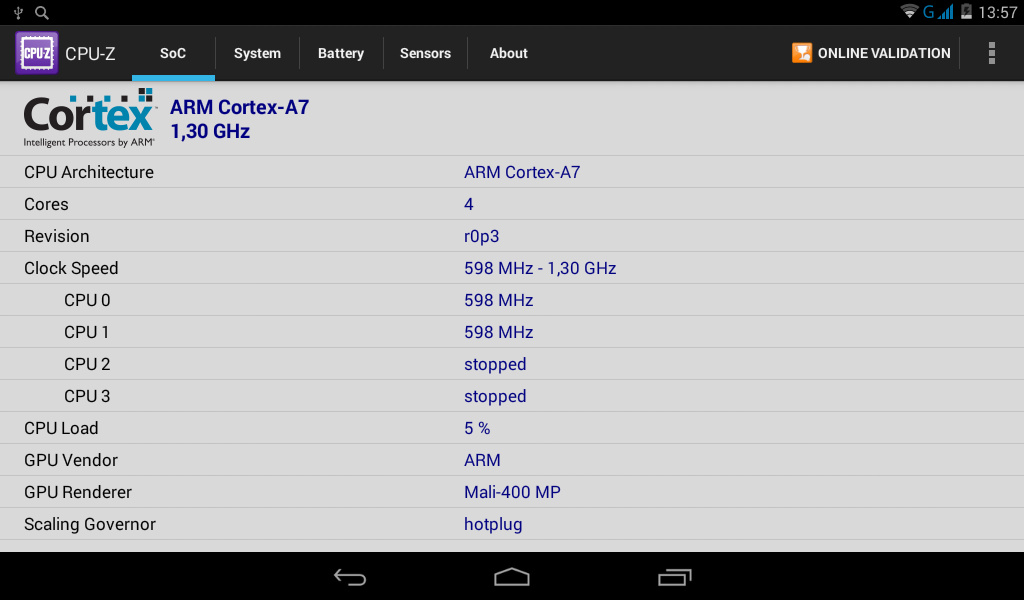 В основе начинки TurboPad 912 лежит система-на-чипе МТK8382. Она включает четырехъядерный процессор Cortex A7 частотой 1200 МГц, графический чип Mali 400MP2, а также 1 Гб оперативной памяти и 8 Гб внутренней памяти. Подобная платформа вполне ожидаема, если вы имеете дело с бюджетным устройством.