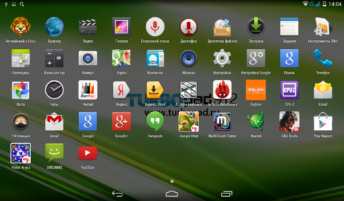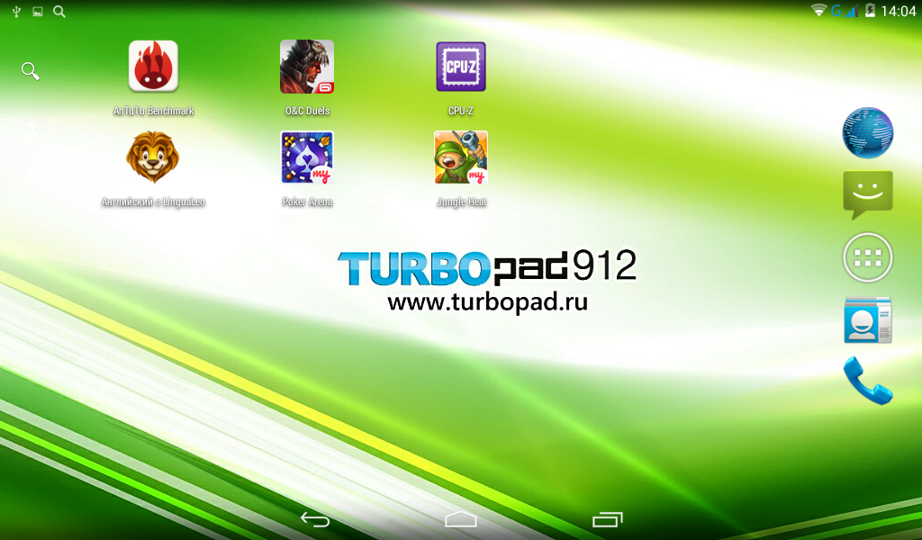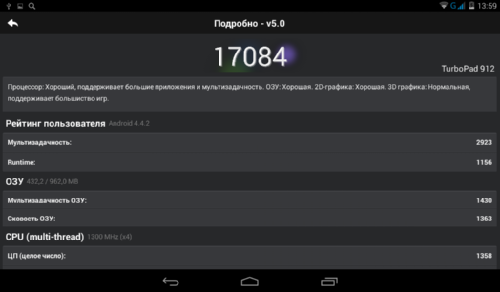 TurboPad 912 управляется операционной системой Android 4.4 KitKat, только начавшей появляться на устройствах эконом-класса. Интерфейс системы работает быстро и плавно, никаких притормаживаний и неприятных прогрузок не обнаружено. Исправно функционируют две шторки: левая для уведомлений и правая – для управления важнейшими функциями.