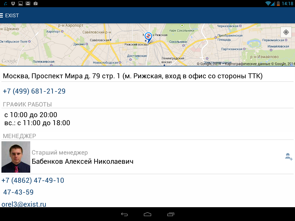 Назначение пункта «Офисы» основного меню следует из его названия – в нем отображается информация об офисах Exist.ru. Однако, как уже упоминалось, фильтрации списка офисов по населенному пункту не предусмотрено.