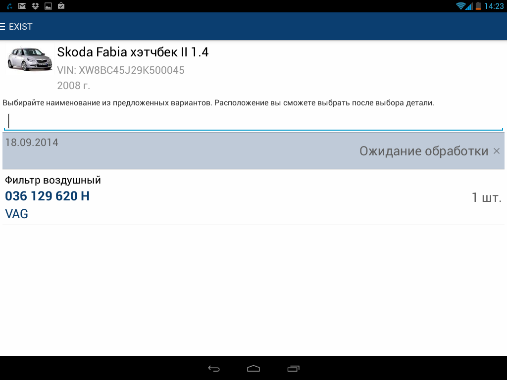 Причем, для подбора по VIN-коду достаточно ввести наименование или фрагмент наименования детали. Довольно удобно. Сделанные ранее запросы по VIN доступны через соответствующий пункт основного меню приложения.