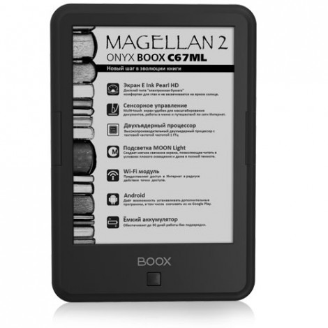Следующая новинка прошлой недели – электронная книга Onyx Boox C67ML Magellan 2 – может похвастаться 6-дюймовым дисплеем E Ink Pearl HD разрешением 758x1024 точек, подсветкой MOON Light и поддержкой мультитач. Также в наличии 2-ядерный 1 ГГц процессор, 512 Мб ОЗУ, 4 Гб встроенной памяти с возможностью расширения картами microSD, модуль Wi-Fi и аккумулятор емкостью 1700 мАч. Работает Onyx Boox C67ML Magellan 2 под управлением операционной системы Android версии 4.2. Поддерживаемые форматы: TXT, HTML, RTF, FB2, FB2.zip, MOBIPOCKET, CHM, PDB, DOC, DOCX, PRC, EPUB (текст), JPG, PNG, GIF, BMP (изображения), PDF, DjVu. Габаритные размеры – 170х117х8,7 мм, вес – 169 г. Девайс предлагается в черном, сером и белом цветах корпуса по цене 6990 рублей. Обложка и зарядное устройство в комплект поставки не входят.