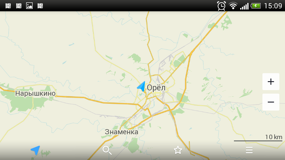 Интерфейс «MAPS.ME» минималистичен. На экране показываются кнопки управления масштабом (при желании их можно убрать и пользоваться только соответствующим мультитач жестом), а также нижняя панель инструментов, содержащая кнопки перехода к текущему местоположению, поиску, перехода к избранному и вызова меню.