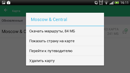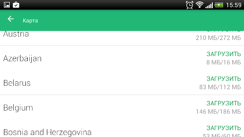 Для загрузки нужной карты потребуется выбрать часть света (Европа, Азия и т.д.) и страну. Карты больших стран, включая Россию, разбиты по регионам. При этом можно скачать, как только карту, так и вариант «карта+маршруты». Также через меню загрузки карт можно просмотреть, какие карты уже установлены на мобильном устройстве. Кстати, если изначально была загружена только карта, то маршруты, при необходимости, можно загрузить отдельно.