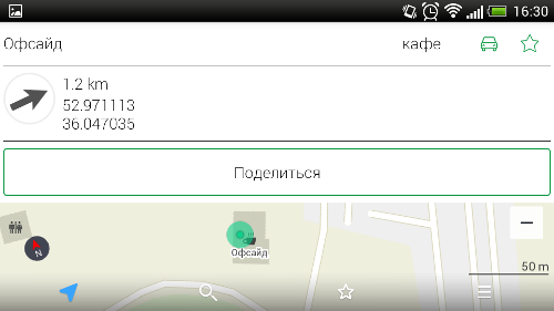 При выборе любого объекта можно получить подробную информацию о нем (включая координаты и расстояние до него), поделиться данными о местоположении, а также добавить в «избранное» и проложить маршрут.