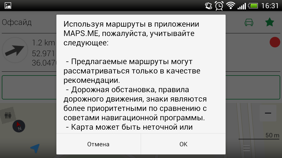 При прокладке маршрута приложение «MAPS.ME» покажет соответствующее предупреждение (что маршрут является лишь рекомендацией, карта может быть неточна, а текущая дорожная обстановка, знаки и разметка важнее, чем рекомендации программы).
