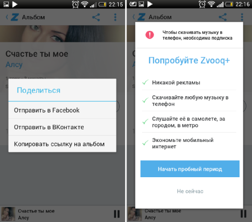 После того как нужный трек или альбом найден его можно прослушать, при этом панель управления плеера отображается в строке уведомлений и на экране блокировки. При желании композицией можно поделиться через ВКонтакте или Facebook. Также можно скопировать ссылку на альбом, добавить трек в свою коллекцию и скачать его.
