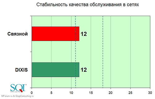 По параметру «стабильность качества обслуживания» сети «Связной» и «DIXIS» в Екатеринбурге показали равные результаты (см. график 2). В целом эти оценки можно отнести к среднему уровню стабильности, то есть в разных салонах сетей «Связной» и «DIXIS» в Екатеринбурге можно встретить различный уровень качества обслуживания, как довольно высокий, так и низкий.