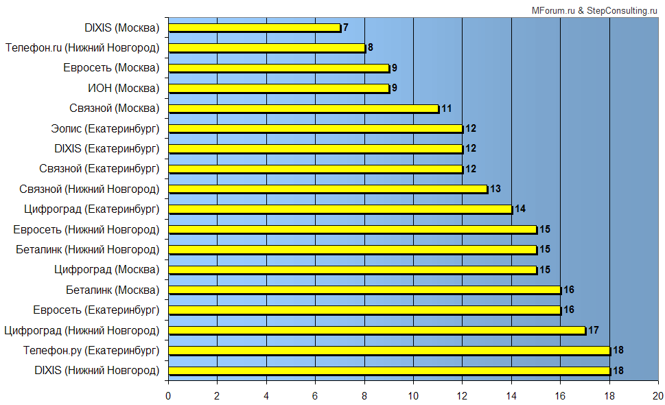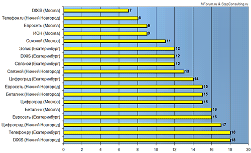 В общем рейтинге стабильности обслуживания в оцененных сетях московское подразделение сети «DIXIS» занимает лидирующее положение. Ее результат – 7 баллов (чем ниже оценка, тем стабильность обслуживания выше). С близким результатом 8 баллов на второе место вышла сеть «Телефон.Ру» в Нижнем Новгороде. Эта сеть и здесь практически ни в чем не уступила московским коллегам. И, наконец, третье место поделили московские «ИОН» и «Евросеть», набрав по 9 баллов. Довольно высокую стабильность обслуживания показал также московский филиал «Связного».