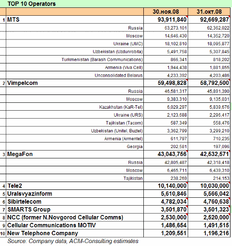 Агентство AC&M распространило свои оценки числа активных SIM-карт на рынке России по итогам ноября 2008 года. Аналитики утверждают, что их число достигло 184 млн, что соответствует росту их числа на 2.3 млн по отношению к октябрю 2008 года и росту на 14.9 млн с ноября 2007 года.