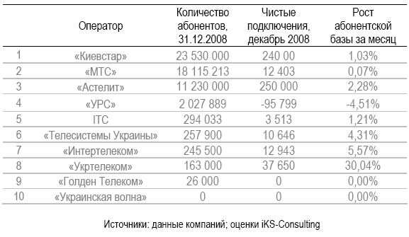 Лидером по новым подключениям в декабре осталась компания «Астелит», увеличившая за прошедший месяц свою абонентскую базу на 250 тысяч пользователей, что на 120 тысяч больше аналогичного показателя ноября 2008 года. По темпам роста продолжает лидировать мобильное подразделение «Укртелекома» - в прошлом месяце темпы прироста абонентской базы Utel составили 30%.