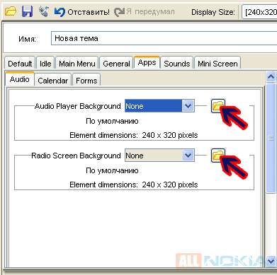 Далее приступим к картинкам для аудио проигрывателя и радио. Это делается на вкладке Apps - Audio. Я вставляла две одинаковые картинки здесь: сначала для Audio Player, затем для Radio (чуть ниже), - пятая из картинок для фона, см. выше.